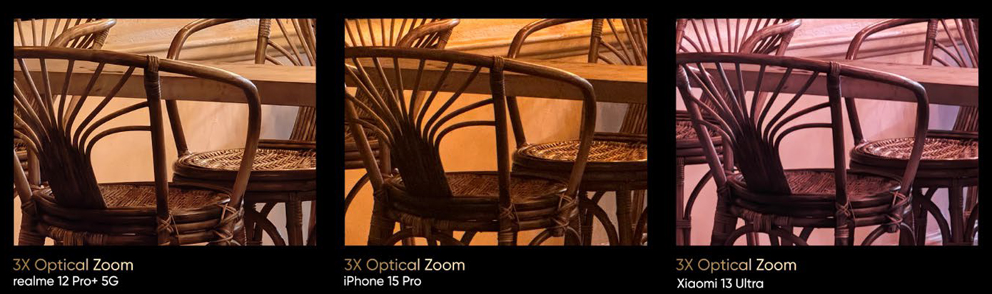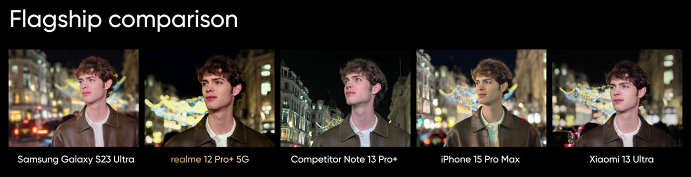 Η λειτουργία πορτραίτου κινηματογραφικού στιλ στο realme 12 Pro+ 5G διαθέτει εστιακό μήκος ισοδύναμο με 80mm. Αυτό βοηθά να φέρει το θέμα στο προσκήνιο, τονίζοντας τη δομή του προσώπου και επιτρέποντας ένα πραγματικό πορτραίτο αντί για ένα χαλαρό κοντινό πλάνο. Η λειτουργία bokeh οπτικού επιπέδου το βελτιώνει περαιτέρω μειώνοντας την εμφάνιση του φόντου ενώ παράλληλα αναδεικνύει τους φυσικούς τόνους του δέρματος. Αυτό δημιουργεί πιο ζωντανά πορτραίτα επαγγελματικού επιπέδου από το iPhone 15 Pro Max και το Redmi Note 13 Pro+ 5G.