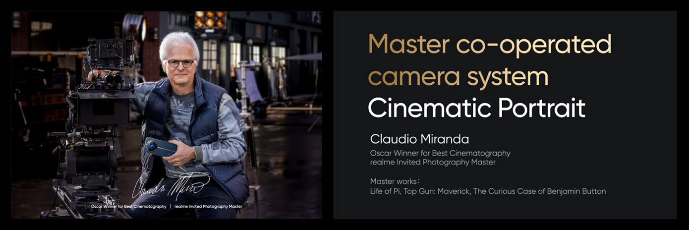 H συγκεκριμένη σειρά υιοθετεί την κινηματογραφική αισθητική. Η κινηματογραφική αναλογία διαστάσεων 2.39:1, είναι σήμα κατατεθέν της κλασικής παραγωγής ταινιών, επιτρέποντας στους χρήστες να αποτυπώνουν τον κόσμο τους χωρίς την ανάγκη περικοπής μετά την λήψη, προσφέροντας ένα ευρύ καθηλωτικό καμβά. Η σειρά realme 12 Pro εμπλουτίζει περαιτέρω την εμπειρία φωτογραφίας με φίλτρα Master Camera, τα οποία έχει προσαρμόσει ο Claudio Miranda, ο βραβευμένος με Όσκαρ διευθυντής φωτογραφίας πίσω από τα αριστουργήματα Life of Pi, Top Gun: Maverick και The Curious Case of Benjamin Button.