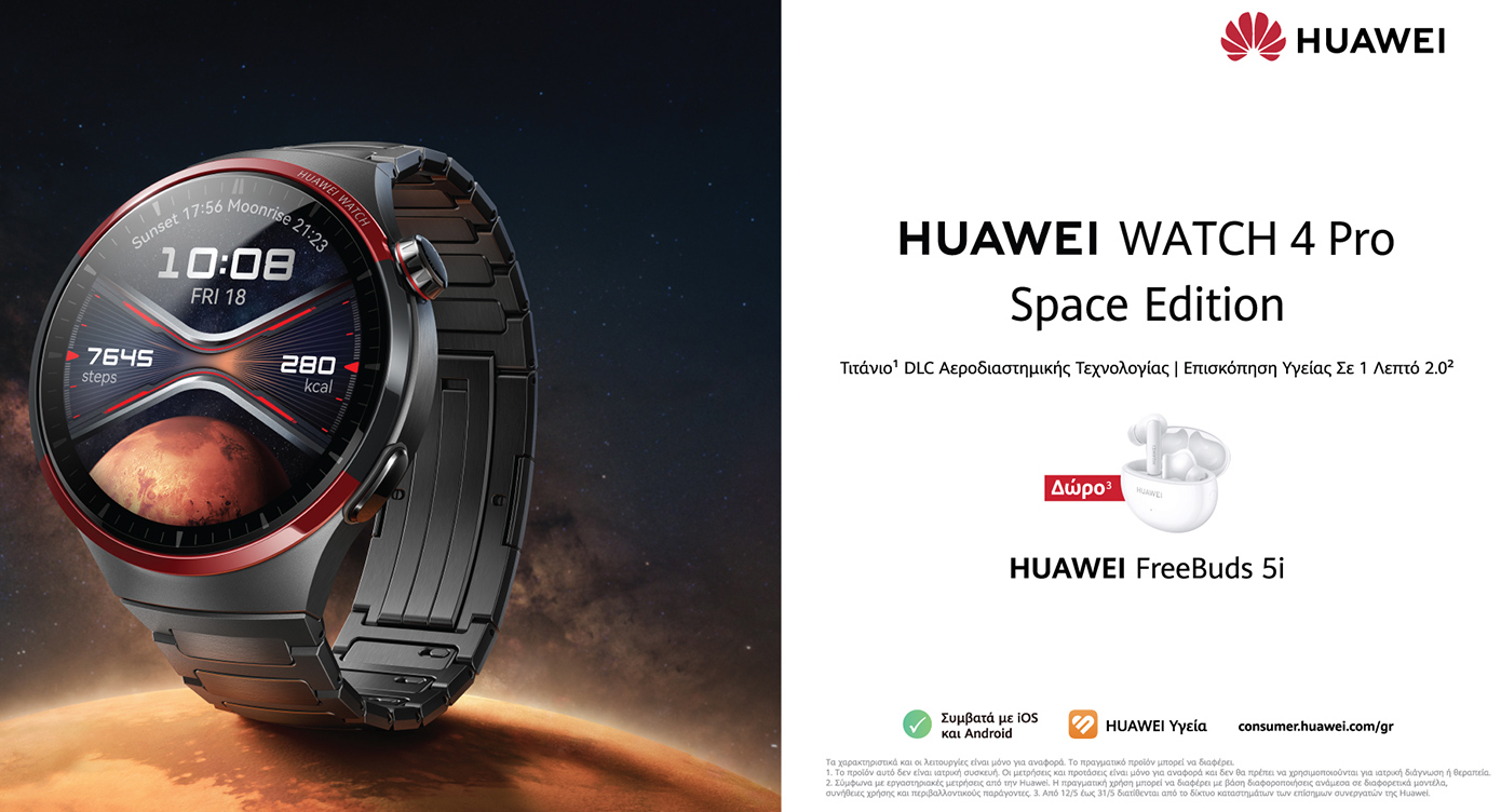 Με την αγορά ενός HUAWEI WATCH 4 Pro έως και τις 31 Μαΐου, παίρνετε δώρο τα απίθανα ασύρματα ακουστικά HUAWEI FreeBuds 5i.