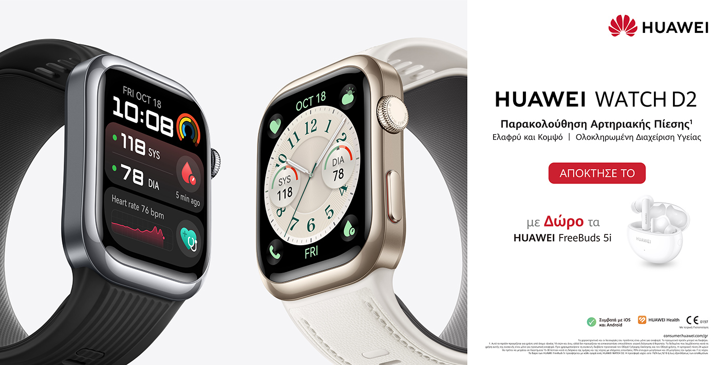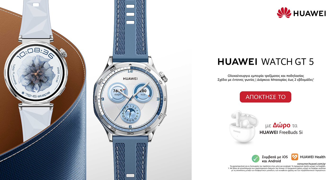 Τα νέα smartwatches HUAWEI WATCH GT5 Series – είναι διαθέσιμα στην ελληνική αγορά για αγορά όλων των εκδόσεων και προπαραγγελία για το GT 5 Pro (42mm) ceramic edition μέσω του δικτύου καταστημάτων των επίσημων συνεργατών της Huawei και για κάθε αγορά, οποιασδήποτε έκδοσης, παίρνετε δώρο τα ασύρματα ακουστικά HUAWEI FreeBuds 5i. Η προσφορά ισχύει έως το τέλος Οκτωβρίου ή έως εξαντλήσεως των αποθεμάτων. Η προτεινόμενη τιμή λιανικής ξεκινάει από 249 Ευρώ.