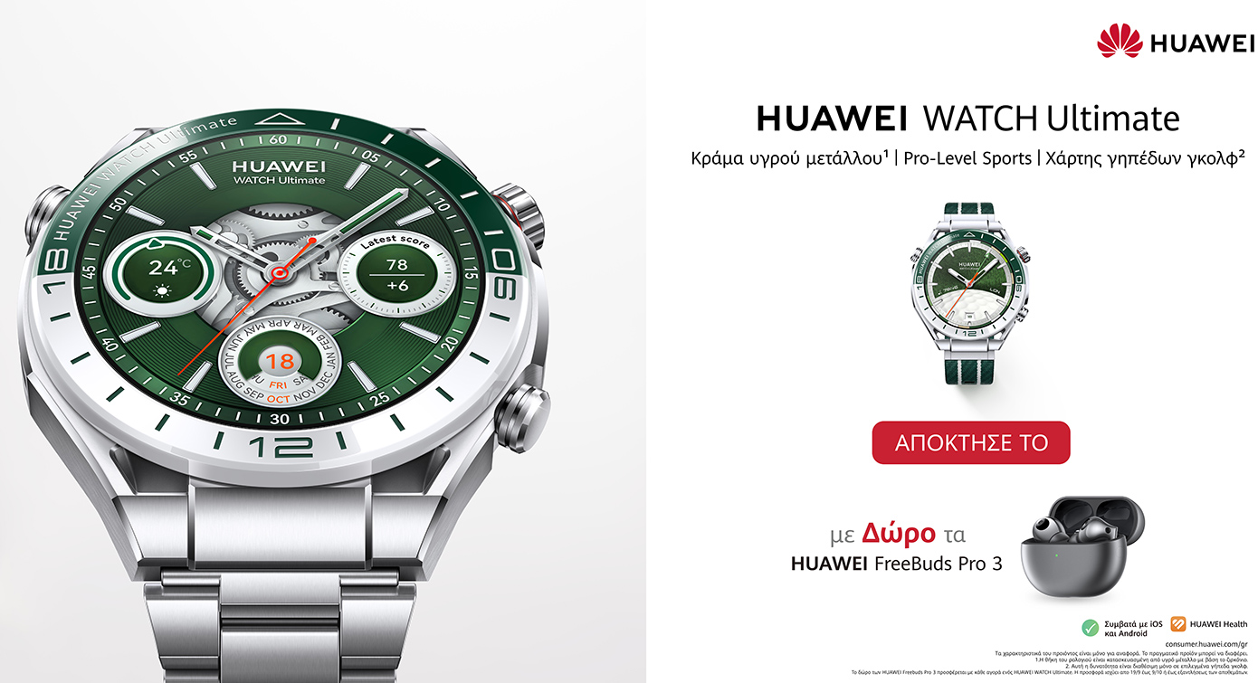 Τα HUAWEI WATCH Ultimate Green Edition και HUAWEI WATCH D2, είναι διαθέσιμα για προπαραγγελία με δώρο τα ασύρματα ακουστικά HUAWEI FreeBuds Pro 3 και HUAWEI FreeBuds 5i, αντίστοιχα με προτεινόμενες τιμές λιανικής 899 και 399 ευρώ αντίστοιχα, μέσω του δικτύου καταστημάτων των επίσημων συνεργατών της Huawei. Η προσφορά ισχύει έως τις 9 Οκτωβρίου ή έως εξαντλήσεως των αποθεμάτων.