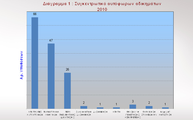 Εξήντα έξι (66) απόπειρες αυτοκτονιών, που εκδηλώθηκαν στο διαδίκτυο χειρίστηκε το Τμήμα Δίωξης Ηλεκτρονικού Εγκλήματος, κατά τη διάρκεια του 2010. Σημειώνεται ότι από το 2004 – έτος ιδρύσεως της Δίωξης Ηλεκτρονικού Εγκλήματος – έως σήμερα έχουν σημειωθεί (141) απόπειρες αυτοκτονιών που εκδηλώθηκαν στο διαδίκτυο.