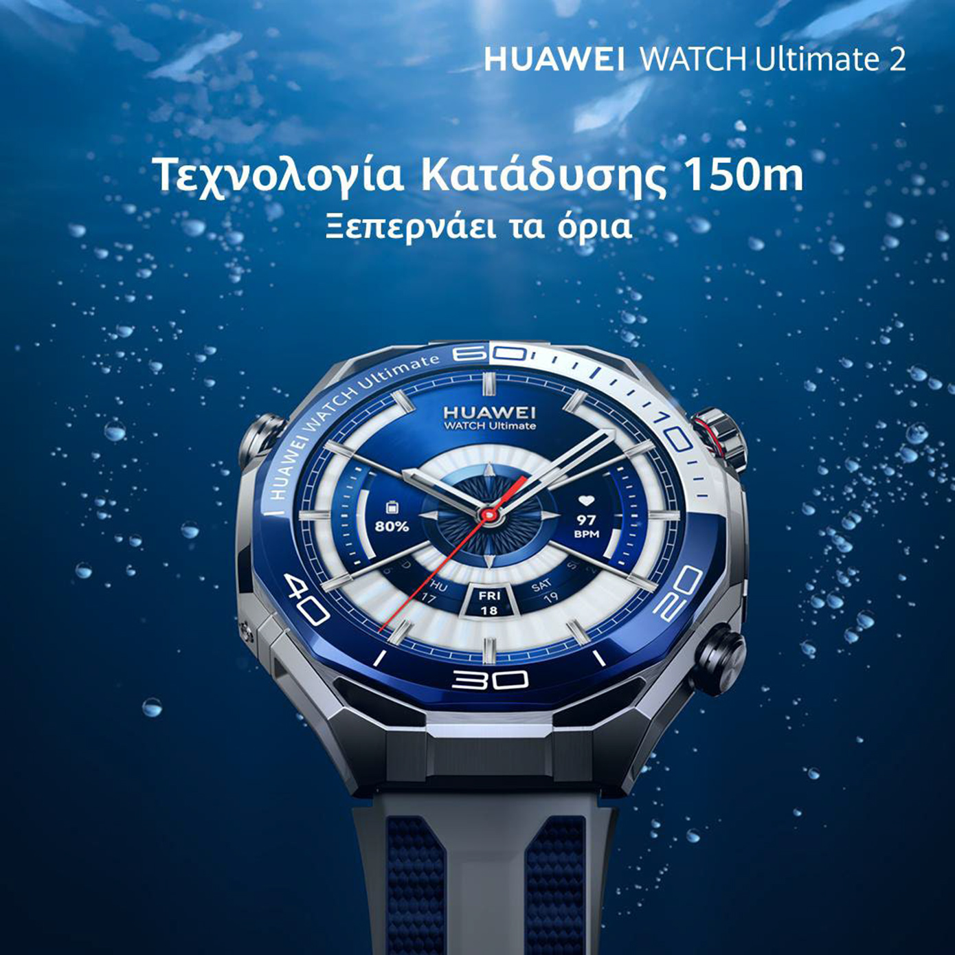 Διαθέσιμο στην Ελλάδα από 8 Οκτωβρίου 2025, είναι το HUAWEI WATCH Ultimate 2, το πρώτο smartwatch που υποστηρίζει υποβρύχια επικοινωνία με τεχνολογία sonar, προσφέροντας ασύγκριτη ασφάλεια και ευκολία στις καταδύσεις. Η συνέχεια του επιτυχημένου HUAWEI WATCH Ultimate, το Watch Ultimate 2, έρχεται με δώρο τα HUAWEI Freebuds Pro 4 με κάθε αγορά.