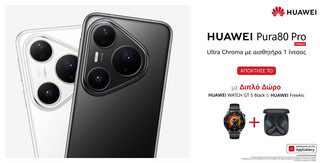 Με κάθε αγορά HUAWEI Pura 80 Pro ή HUAWEI Pura 80 Ultra, οι καταναλωτές λαμβάνουν διπλό δώρο, το smartwatch HUAWEI WATCH GT 5 Black και τα HUAWEI FreeArc ακουστικά. Η προσφορά ισχύει έως τις 4 Νοεμβρίου ή μέχρι εξαντλήσεως των αποθεμάτων.