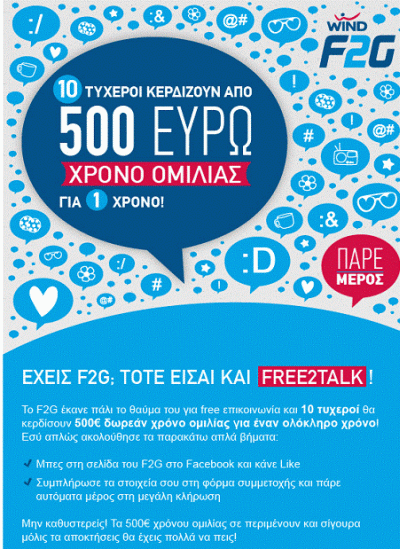 Κάντε like στη σελίδα http://www.facebook.com/WINDF2G από σήμερα κιόλας και λάβετε μέρος στο διαγωνισμό για να κερδίσετε δωρεάν χρόνο ομιλίας για έναν ολόκληρο χρόνο!