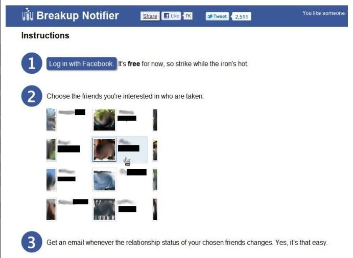 Εδώ έρχεται το breakup notifier. Με το που το εγκαθιστάτε στο facebook, σας βάζει να διαλέξετε ποια άτομα από τους φίλους σας θέλετε να παρακολουθεί (γιατί μπορεί να θέλετε να το παίξετε σε πολλά ταμπλό). Στη συνέχεια, όποιο απ’ αυτά τα άτομα αλλάξει το relationship status του, θα ειδοποιηθείτε άμεσα με e-mail, ώστε να μην χάσετε δευτερόλεπτο απ’ το να προσφέρετε μια παρήγορη αγκαλιά.