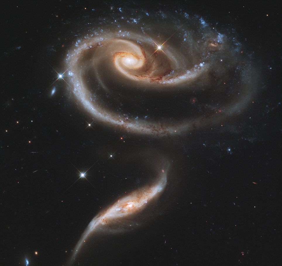 Ο μεγάλος σπειροειδής γαλαξίας, ο UGC 1810, έχει ένα δίσκο που το σχήμα του μοιάζει με ένα τριαντάφυλλο, λόγω της έλξης της βαρυτικής παλίρροιας του γαλαξία από κάτω του, γνωστού ως UGC 1813.