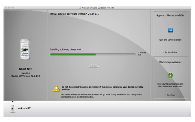 Μέσα από το Nokia Software Updater for Mac οι χρήστες ενημερώνονται για τις πρόσφατες εκδόσεις του λειτουργικού ή των system app, καθώς και για τις αντίστοιχες αναβαθμίσεις. Μπορείτε να κατεβάσετε το λειτουργικό των συσκευών Nokia απευθείας μέσα από τον Mac και να το εγκαταστήσετε στο smartphone. Έτσι, θα έχετε πάντοτε στην συσκευή σας την πιο πρόσφατη έκδοση των Ovi Maps ή του λειτουργικού Symbian.