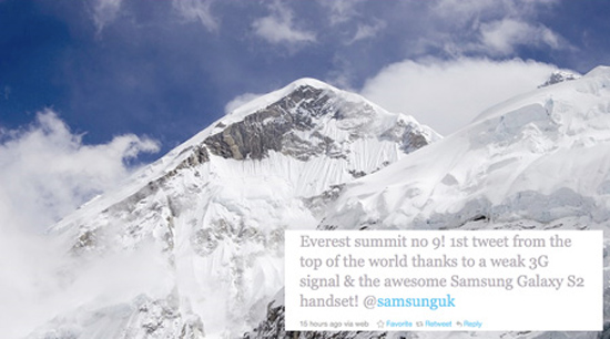 «Κορυφή Έβερεστ νούμερο 9! Το πρώτο tweet από την κορυφή του κόσμου χάρη στο 3G σήμα και στο άψογο Samsung Galaxy S2 κινητό». Το έγραψε αμέσως μετά αφού πραγματοποίησε την πρώτη τηλεφωνική κλήση σε δίκτυο 3G στην ψηλότερη κορυφή του πλανήτη.