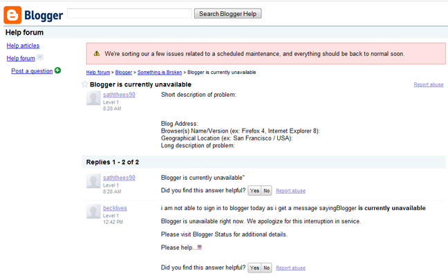 «We’re sorting our a few issues related to a scheduled maintenance, and everything should be back to normal soon» («Προσπαθούμε να λύσουμε κάποια θέματα που αφορούν προγραμματισμένη συντήρηση. Θα επενέλθουμε σύντομα) έλεγε το μήνυμα της Google στη σελίδα της τεχνικής υποστήριξης που αφορά τα blogs.