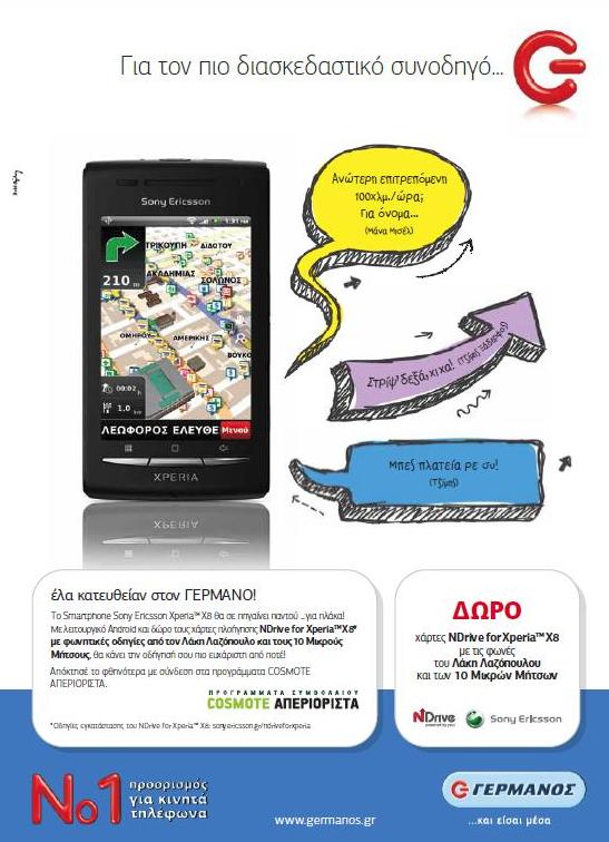 Τη δυνατότητα να αποκτήσουν δωρεάν τον πλοηγό NDrive for Xperia με τις φωνές του Λάκη Λαζόπουλου και των 10 Μικρών Μήτσων με κάθε συσκευή Sony Ericsson Xperia X8, προσφέρει αποκλειστικά στους επισκέπτες του το Δίκτυο Καταστημάτων Γερμανός.