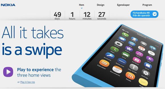 Η αντίστροφη μέτρηση για την κυκλοφορία του Nokia N9 ξεκίνησε από τη Σουηδική ιστοσελίδα της εταιρίας, και απομένουν 49 ημέρες για να δούμε στην αγορά το εντυπωσιακό εμπορικό MeeGo smartphone της εταιρίας, αφού το Nokia N950 απευθύνεται καθαρά σε προγραμματιστές.