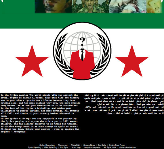 Τους επισκέπτες της σελίδας, σήμερα το πρωί, υποδεχόταν η εικόνα της Συριακής σημαίας και μετά από λίγο εμφανιζόταν το λογότυπο των «Anonymous», στη μέση της σημαίας, με το ακόλουθο μήνυμα γραμμένο σε Αγγλικά και Αραβικά:
