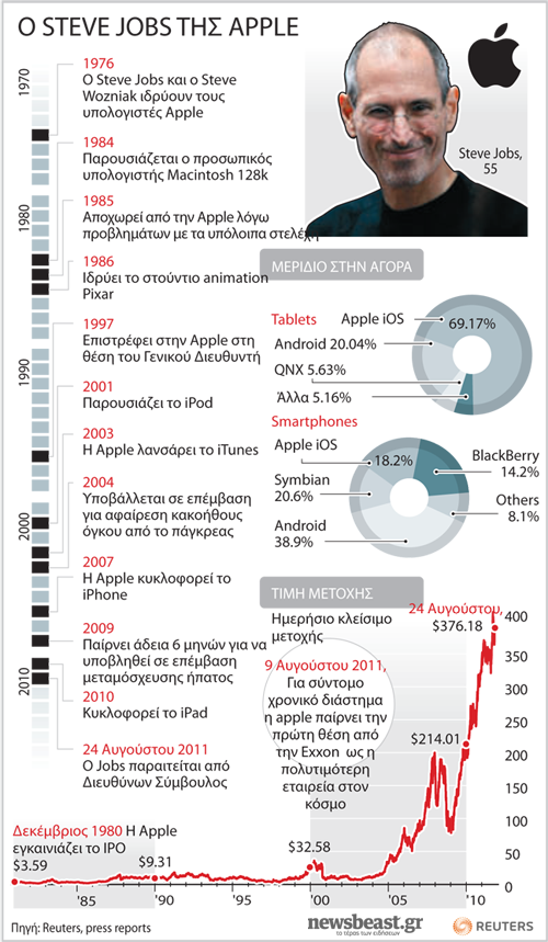 Ο Steve Jobs αφήνοντας τα ηνία της Apple στον Tim Cook, δήλωσε πως δεν είναι πλέον σε θέση να ανταποκριθεί στα καθήκοντά του, διέγειρε μία έντονη φημολογία για χειροτέρευση της υγείας του. Η πορεία ωστόσο ήταν καταλυτική αλλά και συνυφασμένη όμως με αυτή του τεχνολογικού κολοσσού Apple.