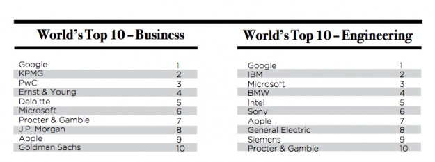 Περισσότερα από 160.000 άτομα που αναζητούν εργασία από τις 12 μεγαλύτερες οικονομίες του κόσμου ρωτήθηκαν στην έρευνα, η οποία διαμοιράστηκε μεταξύ εκείνων που ψάχνουν για μια καριέρα στον τομέα των επιχειρήσεων και εκείνων που ψάχνουν για μια καριέρα στον τομέα της μηχανικής. Η Google ήρθε πρώτη στις προτιμήσεις και στις δύο κατηγορίες ως ο πιο ελκυστικός εργοδότης του κόσμου, για τρίτη συνεχή χρονιά.