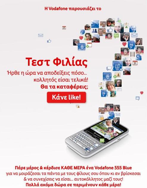 Η Vodafone και το Vodafone 555 Blue, το κινητό που δημιουργήθηκε σε συνεργασία με το Facebook, προσκαλούν όλους τους φίλους του Facebook σε ένα μεγάλο διαγωνισμό… το «Τεστ φιλίας»!