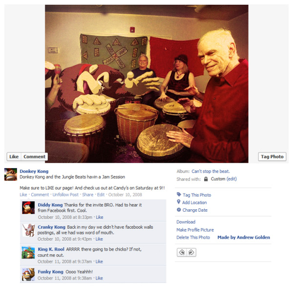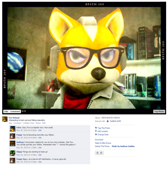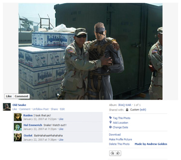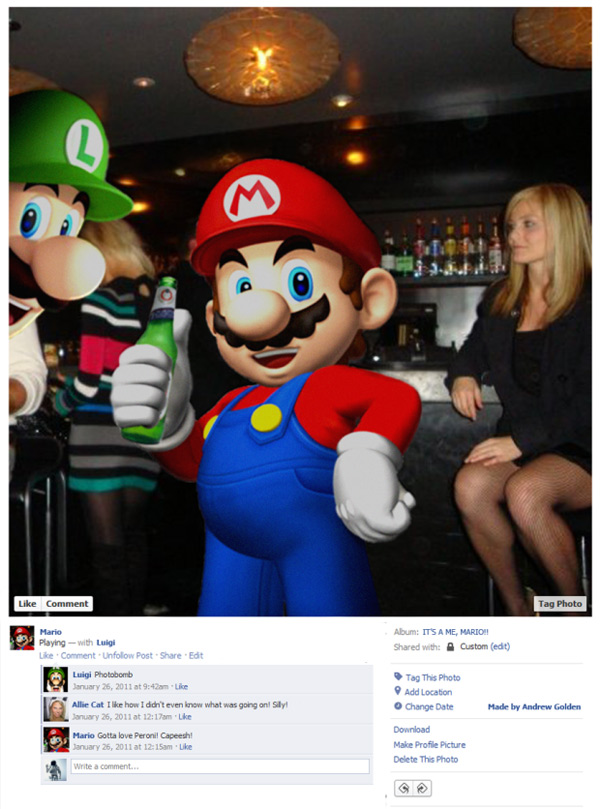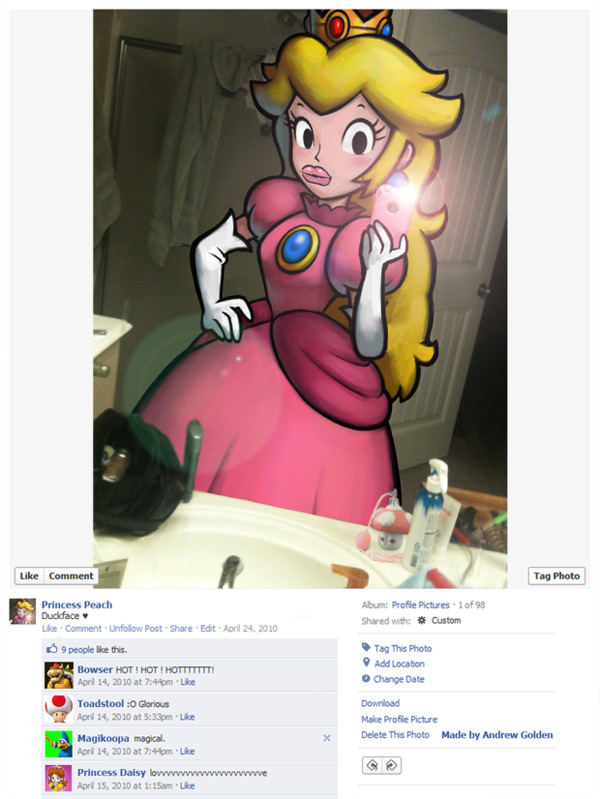 Ο καλλιτέχνης Andrew Golden, δημιούργησε έναν κόσμο, στον οποίο οι διάσημοι χαρακτήρες των ηλεκτρονικών παιχνιδιών έχουν δραπετεύσει από τα στενά όρια της κονσόλας, έχουν φτιάξει λογαριασμό στο Facebook και ανεβάζουν φωτογραφίες από τις βραδινές τους… εξόδους!
