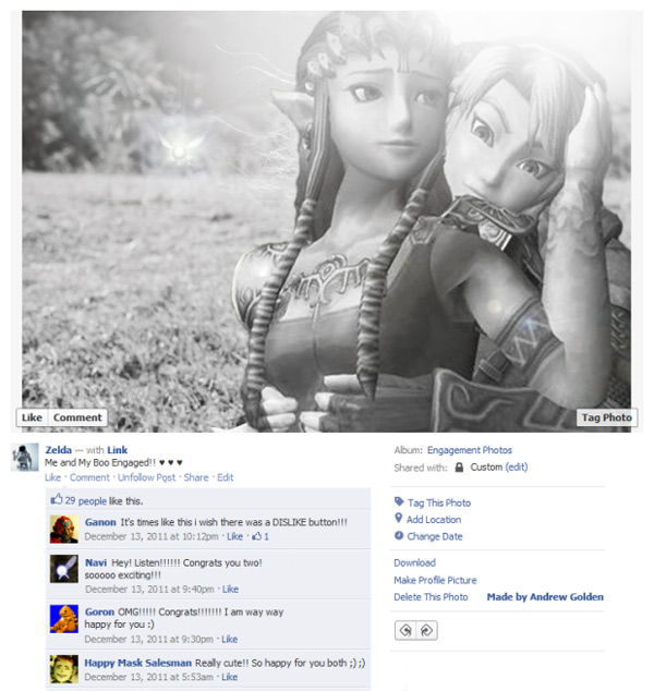 Ωστόσο, οι φωτογραφίες των ηρώων δε σταματούν απλά στα στιγμιότυπα. Περιλαμβάνουν επίσης σχόλια από τους φίλους τους στο Facebook και ανοίγουν συζητήσεις. Για παράδειγμα ο Luigi εισβάλλει σε μια φωτογραφία του Mario, ο οποίος του ζητάει τα ρέστα στο τμήμα σχολίων! Ο Zelda και η αγαπημένη του Link μοιράζονται μια φωτογραφία του αρραβώνα τους και λαμβάνουν τα συγχαρητήρια από τους φίλους στο Facebook.