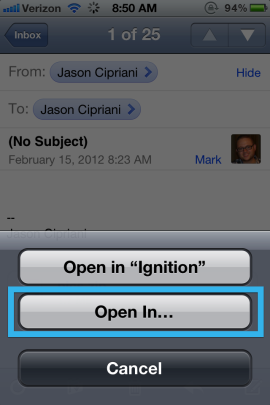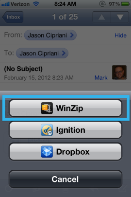 1. Όταν πατήσετε πάνω στο συνημμένο αρχείο για να το ανοίξετε, θα σας παρουσιαστεί μια προεπιλεγμένη μέθοδος για να το ανοίξετε. Εάν το WinZip δεν βρίσκεται στη λίστα, πατήστε Άνοιγμα Σε/Open In.