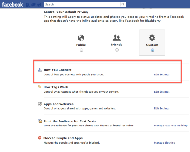 Πηγαίνετε στις ρυθμίσεις απόρρητου κάνοντας κλικ στην επάνω δεξιά γωνία και επιλέγετε τις Ρυθμίσεις Απορρήτου (Privacy Settings). Μετακινηθείτε προς τα κάτω και κάντε κλικ στον σύνδεσμο Επεξεργασία Ρυθμίσεων (Edit Settings) που βρίσκεται δίπλα στο «How You Connect».