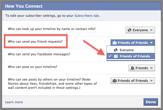 Επιλέξτε να σας έρχονται αιτήσεις μόνο από φίλους φίλων σας (Friends of Friends) και πατήστε Done.