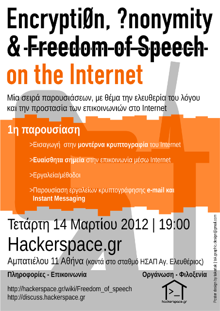Παρουσιάσεις με θέμα την ανωνυμία στο Διαδίκτυο, την ελευθερία του λόγου αλλά και την προστασία των επικοινωνιών στο Internet πρόκειται να πραγματοποιηθούν την Τετάρτη 14 Μαρτίου και ώρα 19:00, στον πολύ όμορφο χώρο του Hackerspace.gr στην Αθήνα.
