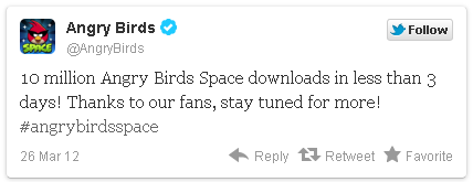 Τα νέα στοιχεία ανακοίνωσε στο twitter το angrybirdsspace. Οι υπεύθυνοι του παιχνιδιού μετέδωσαν: 10 εκατομμύρια downloads των Angry Birds Space σε λιγότερο από τρεις μέρες! Ευχαριστούμε τους οπαδούς μας. Μείνετε συντονισμένοι για περισσότερα!