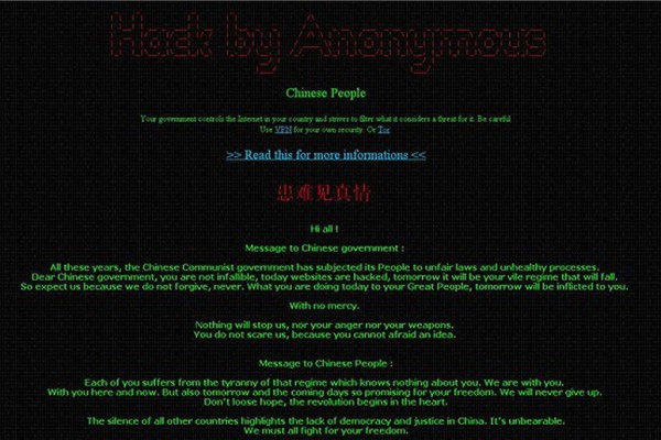 Εναντίον της κινεζικής κυβέρνησης στράφηκε τις τελευταίες ημέρες η οργάνωση των Anonymous και όπως αναφέρει κατάφερε να επιτεθεί σε 500 περίπου κινεζικά sites.