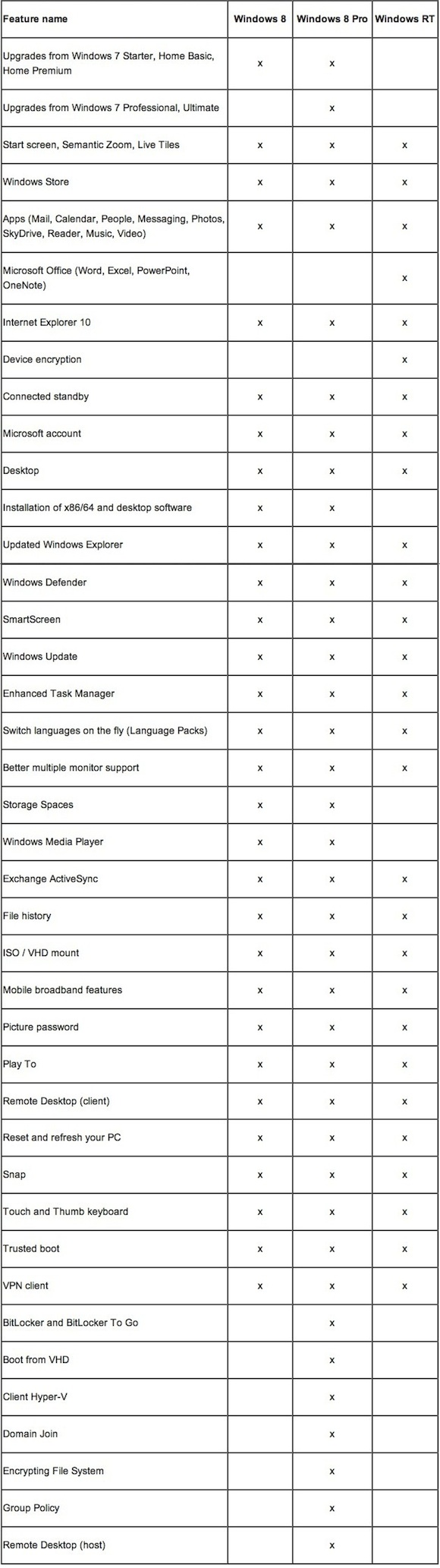 Σημειώνεται ότι το Windows RT είναι το λειτουργικό που θα βρίσκεται προεγκατεστημένο σε tablets με την αρχιτεκτονική ARM, ενώ οι υπόλοιπες εκδόσεις θα απευθύνονται στην πλατφόρμα της Intel. Ουσιαστικά, το RT θα παρέχει τη δυνατότητα στα συστήματα να παραμένουν «ελαφριά».