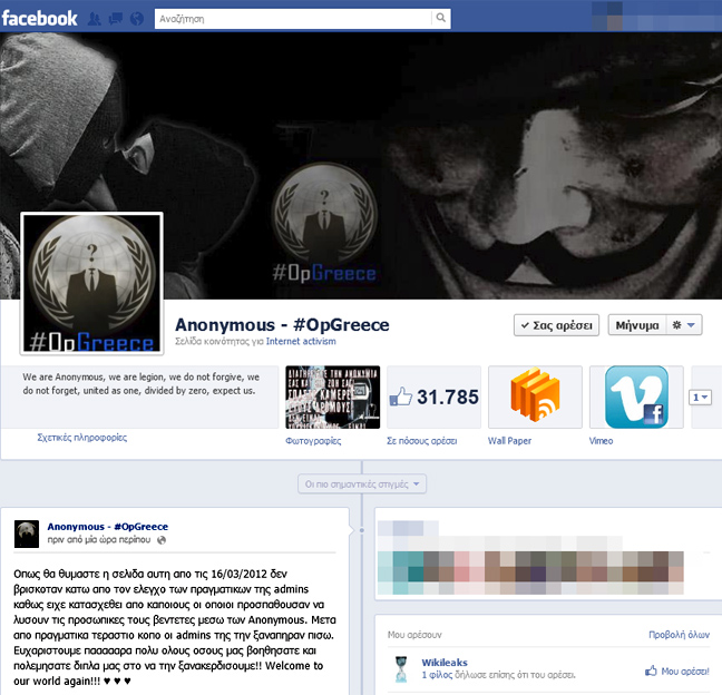 Μετά από σχεδόν δύο μήνες, οι Έλληνες Anonymous, με τη βοήθεια των υποστηρικτών τους κατάφεραν να αποκτήσουν πάλι τον έλεγχο της αρχικής τους σελίδας στο Facebook, η οποία είχε πάνω από 30.000 μέλη και είχε κατασχεθεί από τις 16 Μαρτίου.