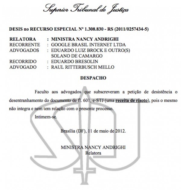 Το περιστατικό συνέβη στη Βραζιλία όπου η Google δέχτηκε αγωγή σχετικά με δημοσιεύσεις που έγιναν στο κοινωνικό της δίκτυο Orkut. Οι δικηγόροι της απάντησαν όπως ήταν φυσικό αλλά, όπως διαπιστώθηκε, συμπεριέλαβαν στην απάντηση τους και μια συνταγή για ριζότο.