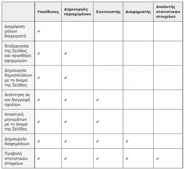 Με τις νέες ρυθμίσεις όμως, υπάρχουν πέντε διαφορετικά επίπεδα διαχειριστών. Το καθένα από αυτά έχει διαφορετικά δικαιώματα. Μπορεί δηλαδή από το να κάνει δημοσιεύσεις και να προσθέτει και να αφαιρεί άλλους διαχειριστές μέχρι να έχει μόνο το δικαίωμα να βλέπει τα στατιστικά της.