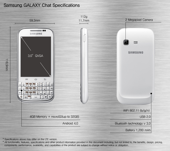 Ένα νέο smartphone ανακοίνωσε η Samsung, το οποίο, όπως φαίνεται και από το όνομά του, απευθύνεται στους οπαδούς των κοινωνικών δικτύων. Το Samsung Galaxy Chat έχει λειτουργικό Android 4.0 Ice Cream Sandwich, οθόνη αφής και πληκτρολόγιο QWERTY.