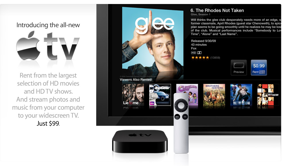 Στο ανανεωμένο AppleTV θα διατίθενται τηλεοπτικά προγράμματα υψηλής ανάλυσης για μόλις 99 σεντς χωρίς διαφημίσεις. Για τους φανατικούς των ταινιών, οι τίτλοι θα διατίθενται προς 4,99 δολάρια και θα είναι διαθέσιμες από την πρώτη μέρα κυκλοφορίας τους σε DVD. Τέλος, θα υπάρχει η δυνατότητα πρόσβασης σε ταινίες στο YouTube και το NetFlix.