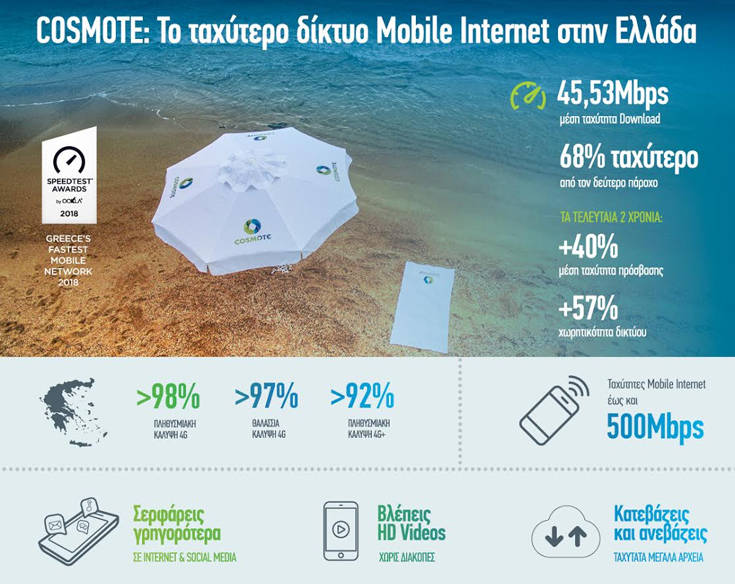 Για το πιο γρήγορο δίκτυο Mobile Internet στην Ελλάδα διακρίθηκε και φέτος η COSMOTE, που διακρίθηκε ως «Greece’s Fastest Mobile Network 2018» στα «SpeedTest Awards» του ανεξάρτητου φορέα Ookla, της διεθνώς αναγνωρισμένης και εξειδικευμένης εταιρείας σε μετρήσεις και επιδόσεις Internet. Το δίκτυο κινητής COSMOTE είναι ταχύτερο κατά 68% από το δεύτερο πάροχο, σε επίδοση download. Για να προσφέρει σε ακόμη περισσότερους καταναλωτές υψηλές ταχύτητες Mobile Internet, η COSMOTE έχει αυξήσει τα τελευταία δύο χρόνια τη μέση ταχύτητα πρόσβασης στο Internet κατά 40% και τη χωρητικότητα του δικτύου κατά 57%. Σύμφωνα με τα αποτελέσματα χιλιάδων μετρήσεων που πραγματοποίησαν οι καταναλωτές χρησιμοποιώντας το SpeedTest σε συσκευές 4G, ο μέσος όρος ταχύτητας για download μέσα από το δίκτυο COSMOTE ήταν 45,53Mbps. Τα αποτελέσματα που αφορούν στα δίκτυα κινητής στην Ελλάδα, βασίζονται συνολικά σε πάνω από 300.000 τεστ, τα οποία πραγματοποιήθηκαν από περίπου 80.000 διαφορετικές συσκευές smartphones iOS και Android όλων των παρόχων, και έγιναν τους τελευταίους 6 μήνες (1ο και 2ο τρίμηνο 2018) σε όλη την επικράτεια.