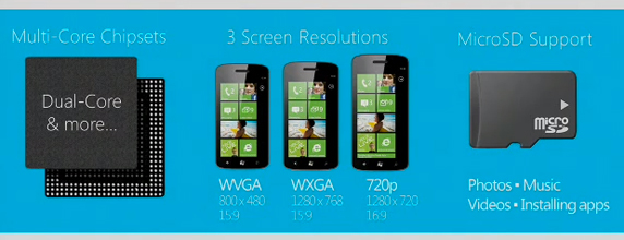 Τα Windows Phone 8 προσφέρουν για πρώτη φορά υποστήριξη διπύρηνων και τετραπύρηνων επεξεργαστών, καρτών MicroSD και τρεις αναλύσεις οθόνης, WVGA, WXGA και 720p.