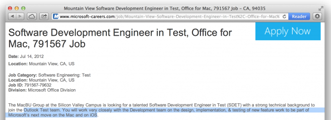 Πρόσφατα όμως η ίδια η Microsoft, ίσως άθελά της, επιβεβαιώνει τις φήμες μέσω μιας σειράς αγγελιών που δημοσίευσε στην ιστοσελίδα microsoft-careers.com. Μια από αυτές αναζητούσε έναν προγραμματιστή για την Outlook Test team προκειμένου να εργαστεί στην «Επόμενη κίνηση της Microsoft στο Mac και το iOS». Μια άλλη αγγελία αναζητούσε μέλος για την Powerpoint Test team.