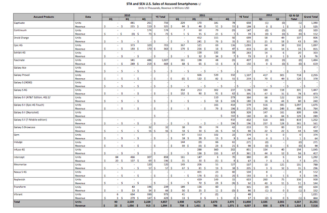 Τα στοιχεία που κατατέθηκαν στο δικαστήριο την προηγούμενη εβδομάδα από τους δικηγόρους της Samsung αποκαλύπτουν πως από τον Ιούνιο του 2010 μέχρι τον Ιούνιο του 2012 η εταιρεία πούλησε 21.25 εκατομμύρια κινητά τηλέφωνα και αποκόμισε κέρδη 7.5 δισεκατομμυρίων δολαρίων. Πέρα από τα τηλέφωνα η Samsung την ίδια περίοδο πούλησε συνολικά 1.4 εκατομμύρια Galaxy Tab και Galaxy tab 10.1, τα οποία της απέφεραν κέρδη 644 εκατομμυρίων δολαρίων.