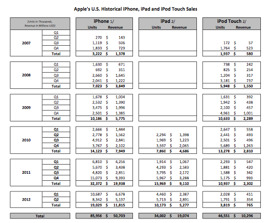 Τα αντίστοιχα δεδομένα της Apple καλύπτουν μεγαλύτερη χρονική περίοδο, από το 2007 μέχρι το δεύτερο τρίμηνο του 2012. Συνολικά η εταιρεία έχει πουλήσει 85 εκατομμύρια iPhone και 46 εκατομμύρια iPod Touch στις ΗΠΑ, με κέρδος 50 και 10.3 δισεκατομμύρια αντίστοιχα. Στα tablet η Αμερικάνικη εταιρεία από το 2010 έχει πουλήσει 34 εκατομμύρια iPad με κέρδος 19 δισεκατομμύρια.
