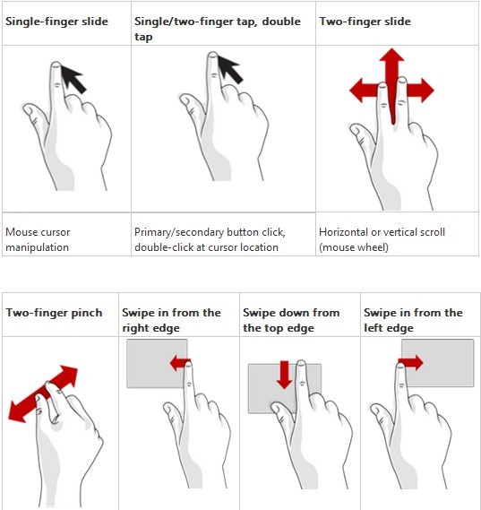 Πέρα από τα tablets, στα οποία η χρήση του λειτουργικού θα γίνεται μέσω της οθόνης αφής, τα Windows RT θα υποστηρίζουν ακόμα και υπολογιστές που διαθέτουν trackpads. Γι’αυτόν τον λόγο η Microsoft έχει ενσωματώσει μια σειρά gestures για καλύτερο έλεγχο συσκευών με επιφάνεια αφής.