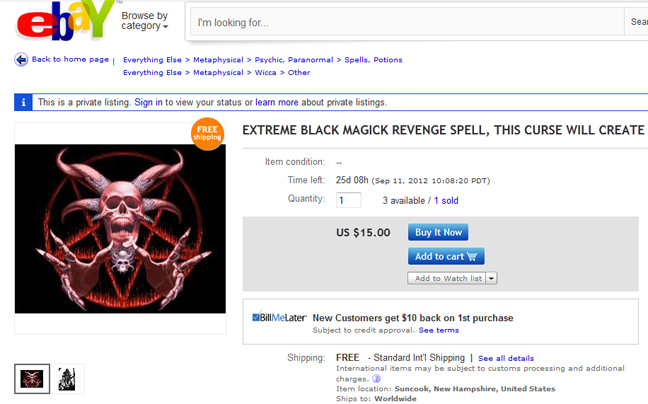 Ανάμεσα στα πιο περίεργα αντικείμενα, ήταν και κάμποσα που έχουν να κάνουν με μαγεία. Ωστόσο, αυτά από τις 30 Αυγούστου θα ανήκουν οριστικά στο παρελθόν, καθώς το site θα απαγορεύσει τις αγγελίες για ξόρκια, μαγικά φίλτρα, κατάρες, προϊόντα μαύρης μαγείας, ερωτικά φίλτρα και παρεμφερή είδη.