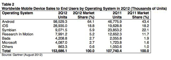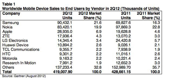 Η εταιρεία αναλύσεων Gartner έδωσε στην δημοσιότητα τα στατιστικά πωλήσεων κινητών και smartphones για το δεύτερο τρίμηνο του 2012. Σύμφωνα με την εταιρεία, παγκοσμίως πουλήθηκαν στους καταναλωτές 419 εκατομμύρια κινητά τηλέφωνα, αριθμός κατά 2,3% μειωμένος από πέρυσι.