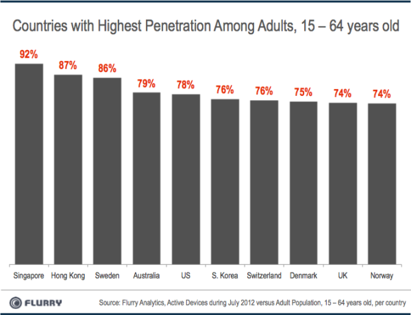 Ενδιαφέρον είναι επίσης τα στοιχεία που έδωσε η Flurry για την διείσδυση που σημείωσαν φέτος οι δυο πλατφόρμες. Στην πρώτη θέση βρίσκεται η Σιγκαπούρη, με τους χρήστες smartphones να αποτελούν το 92% όλων των χρηστών κινητών. Ακολουθεί το Hong Kong και η Σουηδία με 87% και 86% αντίστοιχα ενώ οι Ηνωμένες Πολιτείες βρίσκονται στην πέμπτη θέση με διείσδυση 78%.