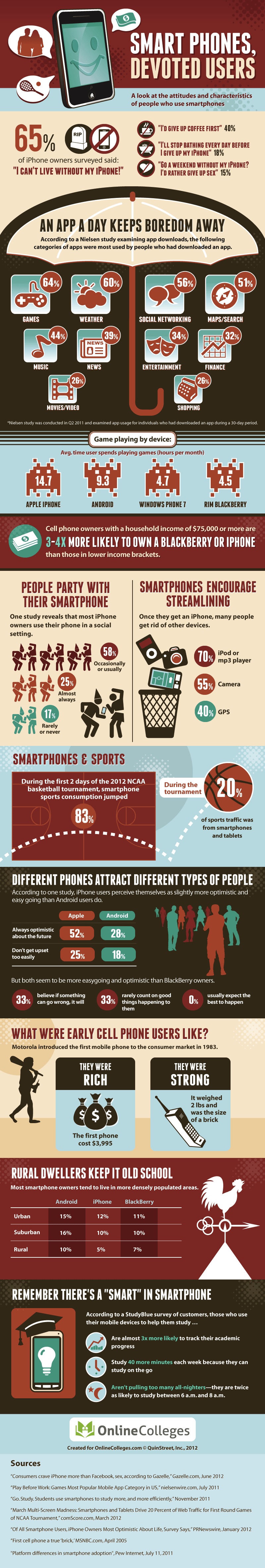 Για παράδειγμα, μία πρόσφατη έρευνα του Gazelle.com αποκαλύπτει ότι το 15% των κατόχων smartphones προτιμούν να περάσουν ένα σαββατοκύριακο χωρίς σεξ παρά να αποχωριστούν το iPhone τους για λίγες ημέρες. Μάλιστα, το 4% δηλώνει ότι έχει χρησιμοποιήσει το iPhone του κατά τη διάρκεια του σεξ, ενώ το 65% παραδέχεται ότι δεν θα μπορούσε να ζήσει χωρίς το smartphone του.