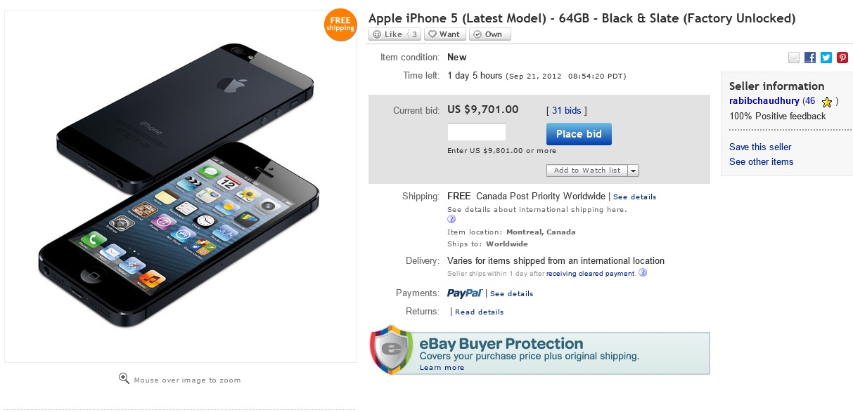 Ήδη στην ιστοσελίδα δημοπρασιών eBay έχουν αναρτηθεί πάνω από 900 αγγελίες με την τιμή των περισσότερων συσκευών να ξεπερνά τα 1.000 δολάρια. Η ακριβότερη αγγελία μάλιστα, για μια ξεκλείδωτη έκδοση του μαύρου iPhone 5 στα 64GB ήδη έχει φτάσει τα 9.701 δολάρια από 31 πλειοδότες!