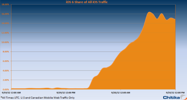 Η μέτρηση της Chitika έχει να κάνει κυρίως με το ποσοστό της κίνησης στους servers της εταιρείας που αφορά το iOS 6. Η απότομη καμπύλη που δημιουργήθηκε ήταν αναμενόμενη αφού αμέσως μετά την κυκλοφορία του λειτουργικού η Apple σημείωσε μαζική αύξηση της κίνησης στους servers της.