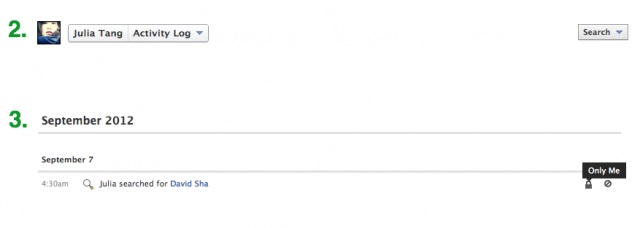 Για να δείτε το ιστορικό αναζήτησης θα πρέπει να πάτε στο Timeline σας και να πατήσετε το κουμπί του «Activity Log» πάνω δεξιά. Ακολουθώντας τα βήματα που βλέπετε στις παρακάτω εικόνες θα μπορείτε να δείτε το ιστορικό σας, να επαναλάβετε τις αναζητήσεις που είχατε κάνει στο παρελθόν αλλά και να το διαγράψετε.