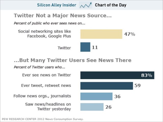 Από τους χρήστες του Twitter τώρα, το 83% χρησιμοποιεί την υπηρεσία microblogging για την ενημέρωση του, το 59% κάνει retweet νέα και ειδήσεις και το 36% έχει κάνει «follow» ιστοσελίδες ενημέρωσης και δημοσιογράφους.