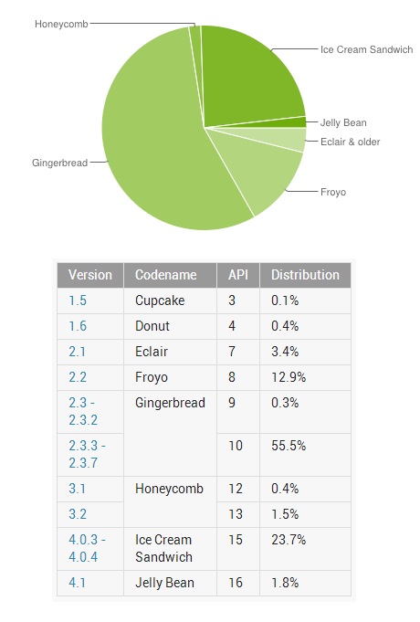 Η τελευταία έκδοση του Android, 4.1 Jelly Bean συγκεντρώνει το διόλου τιμητικό ποσοστό του 1,8% χωρίς όμως ακόμα να έχει διανεμηθεί σε όλες τις κατασκευάστριες εταιρείες. Προς το παρόν λίγες είναι οι συσκευές που χρησιμοποιούν το Jelly Bean, ανάμεσα τους Google Galaxy Nexus, το Nexus 7 και το Galaxy Note 2.