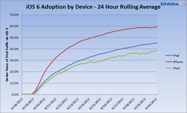 Η εταιρεία αναλύσεων και διαφήμισης Chitika δημοσίευσε σήμερα ανανεωμένα στατιστικά που δείχνουν πως το 60% των χρηστών iPhone έχουν ήδη αναβαθμίσει τις συσκευές τους στο iOS 6. Το ποσοστό διείσδυσης για τους χρήστες iPad και iPod Touch ανέρχεται στο 45% και 39% αντίστοιχα.